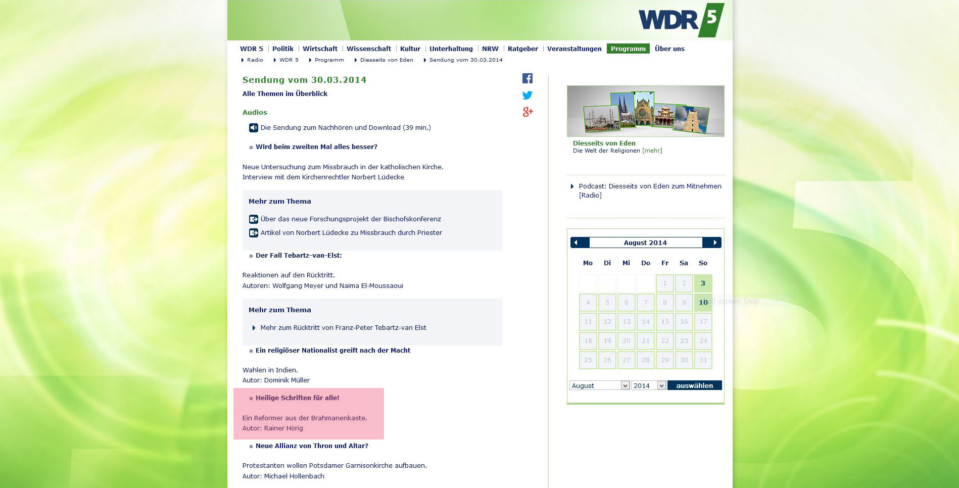 WDR 5, Diesseits von Eden, 30. März 2014